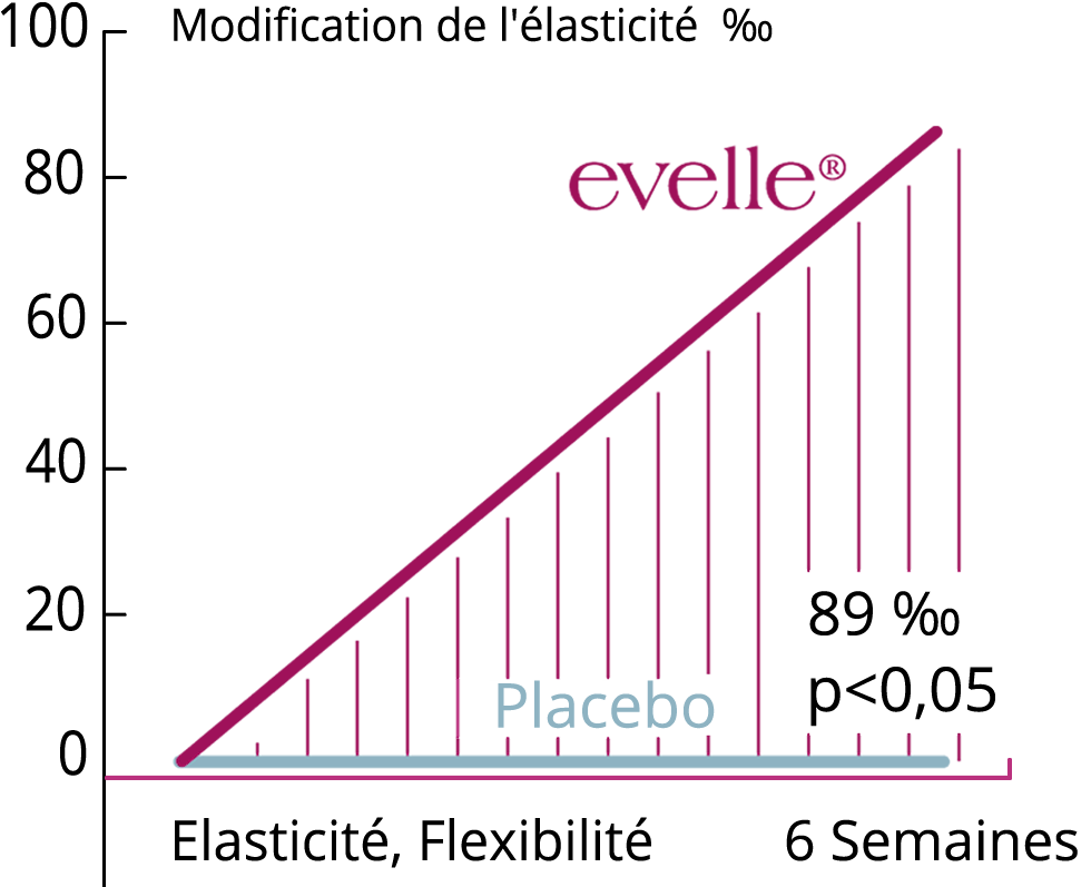 Le résultat global de l'essai clinique contrôlé par placebo montrait que la peau était significativement plus élastique après 6 semaines.